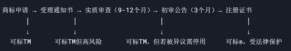 “TM”仅为商标使用声明,无法阻止他人抢注相同商标。例如:A公司申请商标后标TM使用,B公司在A商标公告期内抢注成功,A反而可能被诉侵权。