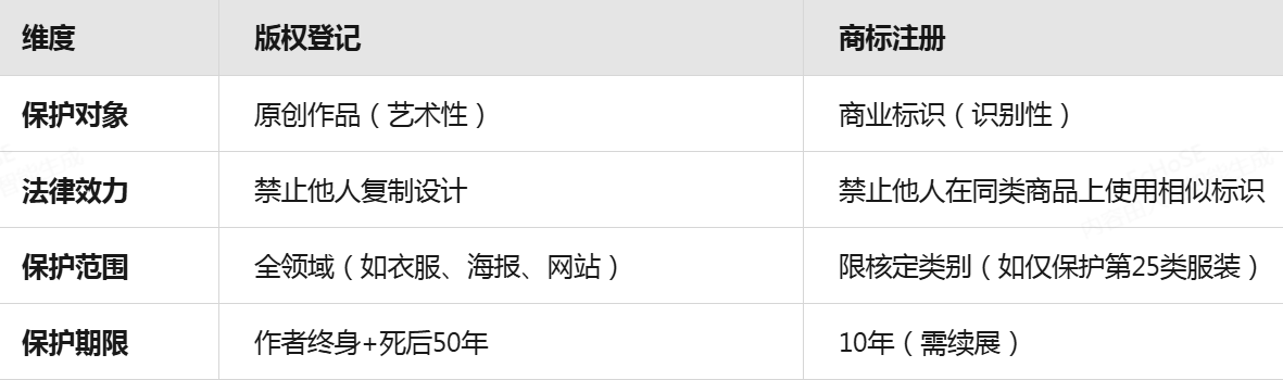 若因预算限制未进行全类别商标注册,版权登记可作为一种低成本、跨类别的初步防御手段,防止他人直接复制你的设计用于其他领域。