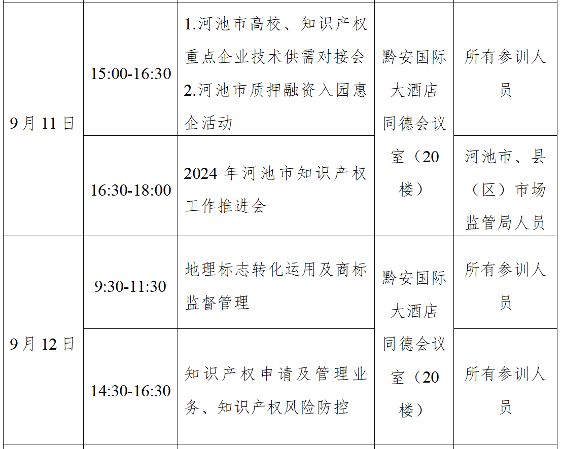 (2024年9月12日,河池讯) 为提升服务基层的专业能力,近日,广西护苗科技发展有限公司 派员参加了由河池市市场监督管理局与广西知识产权维权援助中心河池分中心联合主办的 “2024年河池市知识产权业务培训班暨全市实施商标战略助力乡村振兴大宣讲活动” 。本次活动于9月11日至12日在河池市金城江区举行,汇聚了全市知识产权工作者与相关企业代表。
