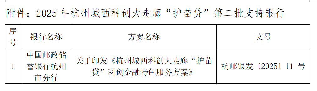 关于2025年杭州城西科创大走廊“护苗贷”第二批支持银行的公示