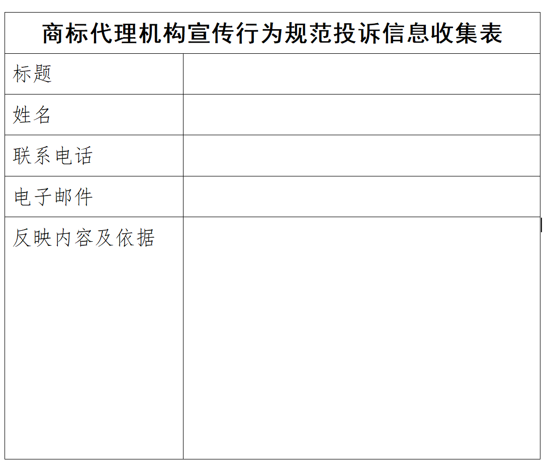 (四)协会鼓励社会公众对代理机构违反规范行为进行举报,可通过填写附件《商标代理机构行为规范投诉信息收集表》向协会反映问题。