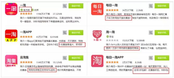 这种方法主要是针对一些大家都非常熟知的APP,比如说像淘宝、京东,可能大家都知道哪一个是正版。但如果是一些基于这些知名品牌的衍生APP呢?比如说搜淘宝旗下的「一淘」时,出现了很多长得特别像的 App ,他们除了名字、图标高仿正版软件外,无一例外都在用尽力气强调“这里有优惠,还能返现,快来买呀……”