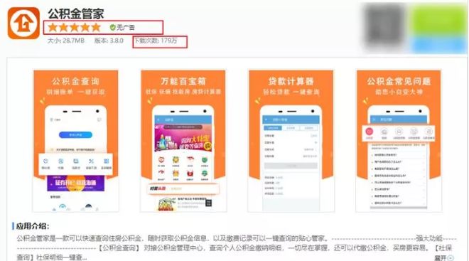 这种方式就是打着原主的旗号,进行挂羊头卖狗肉的骚操作。 比如在软件商城上发现了一个顶着 5 星好评的公积金查询软件,它的应用介绍上明明白白地写着:可以快速查询公积金,是功能强大的贴心管家。
